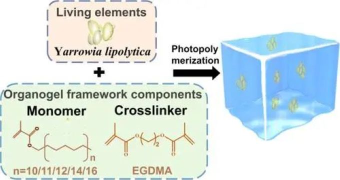 在地球上广泛存在着一类油性微生物(Oleaginous microorganisms),它们因为可利用疏水物质而在各种领域受到广泛关注。若能将亲油性微生物包埋在疏水材料中,不仅可提升微生物的稳定性、重复利用性、可操作性等,还可实现复杂结构化学品混菌发酵中的碳源利用正交化(将油性微生物限制在油相环境中,避免与其它水相微生物竞争水溶性碳源)。有机胶作为一类具有三维聚合物网络的新型疏水、亲油性材料,有潜力用于包埋油性微生物。但是,由于其制备过程通常需使用有毒的有机溶剂与成胶剂以及高温等苛刻条件,高生物相容性的有机胶包埋材料的设计与制备仍具有挑战性。