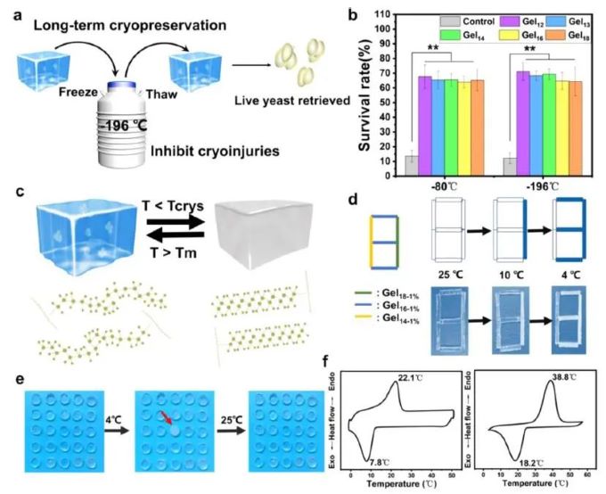 活体细胞、微生物等在深低温环境中可处于“休眠状态”,因此深低温冻存常用于生物样本的长期保存。但是,冷冻-融化过程中的低温损伤对于活体细胞和微生物十分致命。在本文中,作者还利用有机胶超低温冻存保护油性酵母。结果表明,在-80℃和-196℃下冻存后的油性酵母存活率显著高于对照组,证明有机胶可保护酵母免受冷冻损伤,有望实现酵母的长期超低温冻存(图4)。
