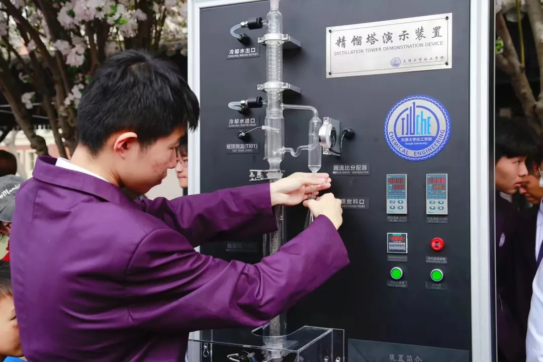 现场精馏塔演示高度酒制作工艺,同学们直呼:“原来化工离我们这么近!”