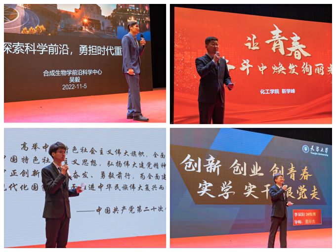 化工学院青年教师代表吴毅以《探索科学前沿,勇担时代重任》为主题,分享了团队在合成生物学领域的研究内容和科研成果。学院辅导员靳学峰号召广大青年学子牢记初心使命、坚定政治立场,勇担时代重任、练就过硬本领,脚踏实地做好每一件小事,让青春在奋斗中焕发绚丽光彩。2019级应用化学专业本科生王涛结合党的二十大报告,宣讲了王静康院士一次次攻克“卡脖子”难题,以及矢志为党育人、为国育才的感人事迹。2020级材料化工专业博士生李双阳讲述了自己砥砺求学,梦圆天大的青春故事,勉励广大青年在青春的赛道上跑出更好成绩。