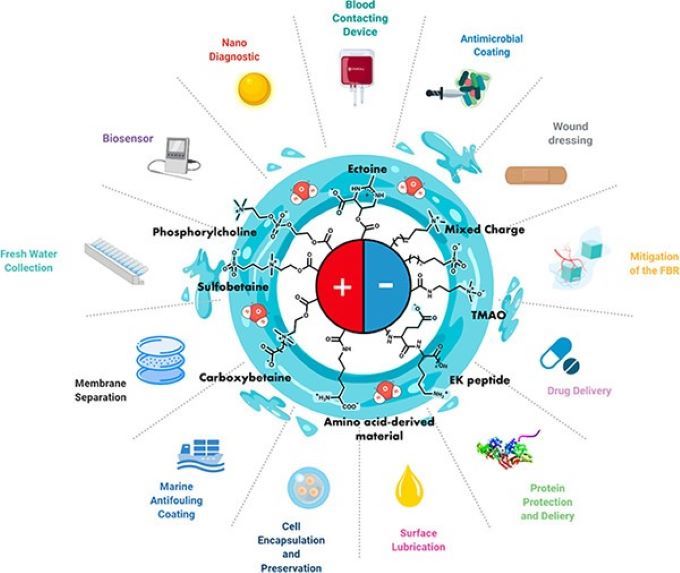 “两性离子聚合物(zwitterionic polymers)”是一类在重复单元上具有一对相反电荷的聚合物材料,可通过离子溶剂化作用发生水合效应,且强于传统非离子型亲水材料通过氢键作用产生的水合效应。两性离子聚合物具备两个主要特点:(1)电荷平衡——正负电荷基团的量相等;(2)最小化偶极——正负电荷在分子水平均匀分布。由于这些特性,两性离子聚合物不会因局部产生电荷而静电吸附蛋白质。这种强水合效应、电荷平衡、最小化偶极决定了两性离子材料的优异抗生物黏附性,包括抗非特异性蛋白质吸附、抗细胞黏附、抗血栓形成、抗免疫排斥反应(Foreign body reaction,FBR)、抗细菌黏附及生物膜形成、抗海洋生物污损等。因此,两性离子材料在血液接触设备、植入设备、医疗设备润滑、抗菌涂层、伤口敷料、纳米医用材料、海洋涂料、抗污分离膜、仿皮肤传感器等生物医学应用以及工业应用中获得广泛关注。另外,除了具备突出的抗生物粘附性,由于强水合效应,两性离子材料能够有效降低冰点,抑制冰成核与生长、修饰冰晶形貌,表现出突出的抗冻性能。