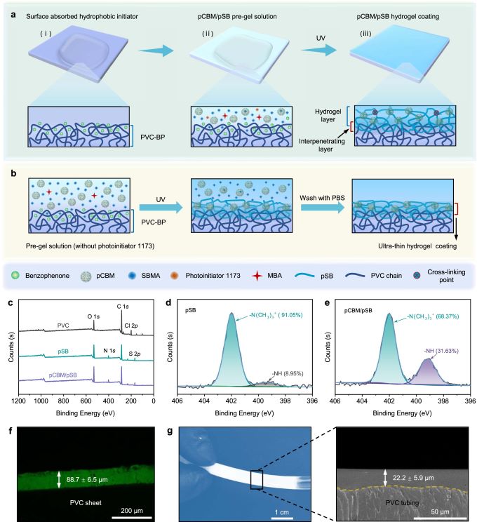 近日,天津大学化工学院李俊杰教授、张宏副研究员联合天津医科大学冯世庆教授团队报道了一种聚羧基甜菜碱微凝胶增强聚磺基甜菜碱(pCBM/pSB)纯两性离子水凝胶涂层。pCBM/pSB水凝胶具有独特的两相结构,其中稀疏交联的pSB聚合物网络作为连续相,通过分子间强大的静电相互作用“锁定”整个水凝胶来限制形变。而分散相是由相互渗透的pSB和pCB聚合物链组成的双网络微凝胶。均匀分散的pCBM不仅可以作为交联位点提高机械强度,而且在受到外力作用时,通过自身产生的形变,以增强能量耗散,避免应力集中,提高水凝胶的机械性能和稳定性。在此基础上,作者采用了一种简单的表面引发策略以提高pCBM/pSB水凝胶和PVC基材之间的结合力(图1)。在紫外光照下,亲水性光引发剂1173用于形成pCBM/pSB水凝胶。而疏水性光引发剂BP用于介导界面层中的SBMA单体的聚合,并与PVC链间形成缠绕结构。当水凝胶涂层受到外力破坏时,良好的界面结合力使能量从表面转移到pCBM/pSB水凝胶,通过水凝胶内部的能量耗散机制避免水凝胶涂层与基材分离。