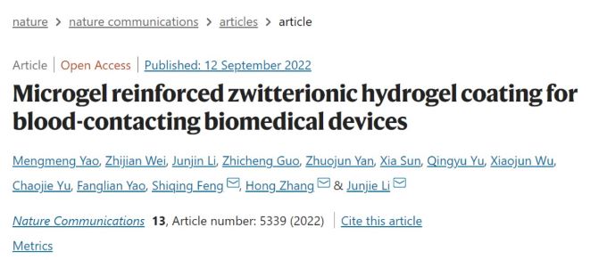 血栓和感染是血液接触生物医学设备在临床应用中面临的主要挑战。蛋白质、细菌和血小板的非特异性粘附是造成血栓和感染等问题的主要原因。两性离子水凝胶的超亲水特性和优异的抗蛋白非特异性吸附性能,使其在血液接触设备表面抗凝涂层的构建中展现出巨大的应用前景。