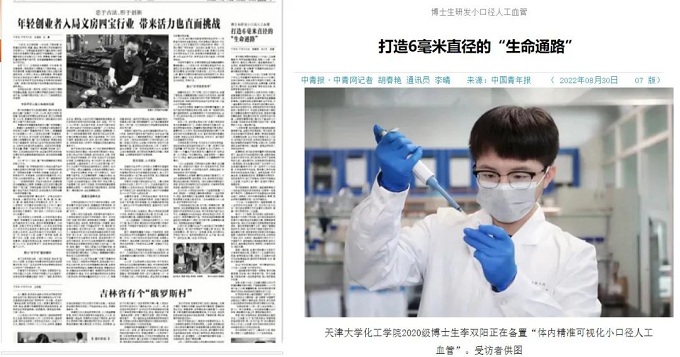 “体内精准可视化小口径人工血管”由天津大学化工学院董岸杰教授团队的2020级博士生李双阳研发,目前这款双层结构水凝胶人造血管已进入大动物实验阶段,这意味着,这款直径不足6毫米的“生命通路”离走出实验室、走到患者身边越来越近了。