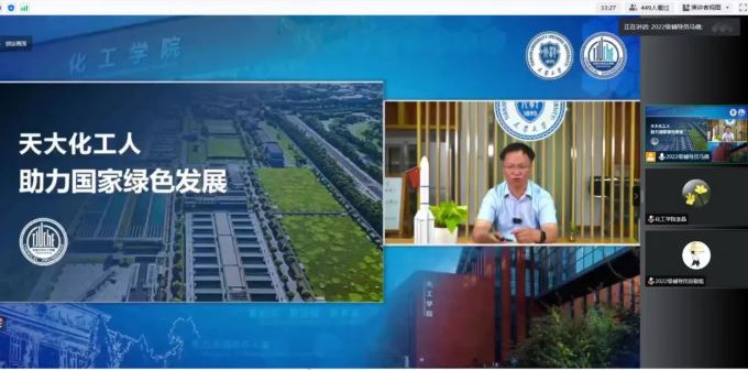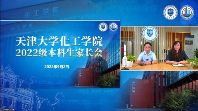 2022年9月2日18点半,天津大学化工学院2022级本科生家长会通过线上直播进行。化工学院院长马新宾,党委副书记李晶,研究生辅导员范凯,2022级本科生辅导员马倩、段敬旭出席会议,来自全国的400余名新生家长线上参会,会议由李晶主持。