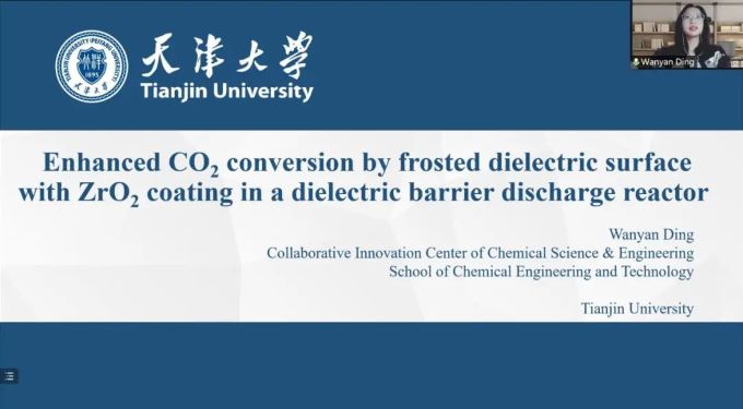 天津大学化工学院刘昌俊教授指导的2020级硕士生丁婉艳在线参加会议,并做口头报告,报告题目为“Enhanced CO2 conversion by frosted dielectric surface with ZrO2 coating in a dielectric barrier discharge reactor”。经过大会组织委员会评审,丁婉艳同学的口头报告获得最佳口头报告奖(Best Oral Presentation Award)。