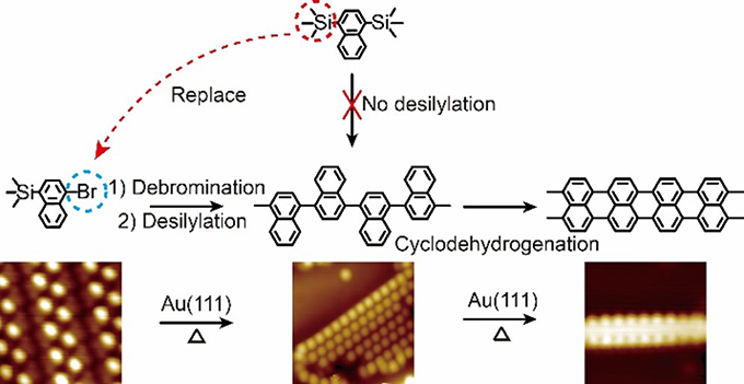 该研究通过双反应基团C(sp2)-Si和C-Br之间的协同效应,利用C-Br基团Ullman反应中的金属有机中间态,催化活化C(sp2)-Si基团,实现高效脱TMS化学反应。本文最大的亮点是,能够利用表面化学反应中多反应基团彼此之间复杂的相互影响(协同效应),针对某一较难发生化学反应的特定基团实现化学反应发生。该工作是在实验(孙志祥 副教授、高洪营 教授)+理论(韩优 教授)+化学合成(赵东兵 教授)精诚合作下共同完成的,其中实验部分扫描隧道显微镜对该反应中的各分子状态进行了高分辨成像,DFT理论计算在电子水平揭示了金属表面发生的反应路径和作用机制,精准化学合成让我们的研究更加全面以及验证了双反应基团协同效应的普适性。