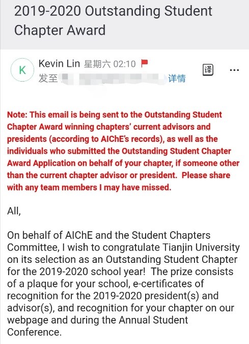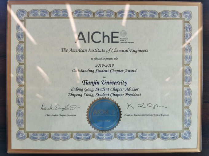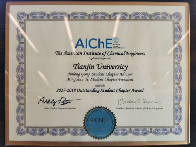 近日,美国化学工程师协会(American Institute of Chemical Engineers, AIChE)公布了2019-2020年度全球杰出学生分会奖(Outstanding Student Chapter Award)获奖名单。AIChE天津大学学生分会再次荣获这一奖项,这也是自2016年AIChE天津大学学生分会成立以来连续四年获得该奖项,是中国大陆唯一一个获得该奖项的学生分会。