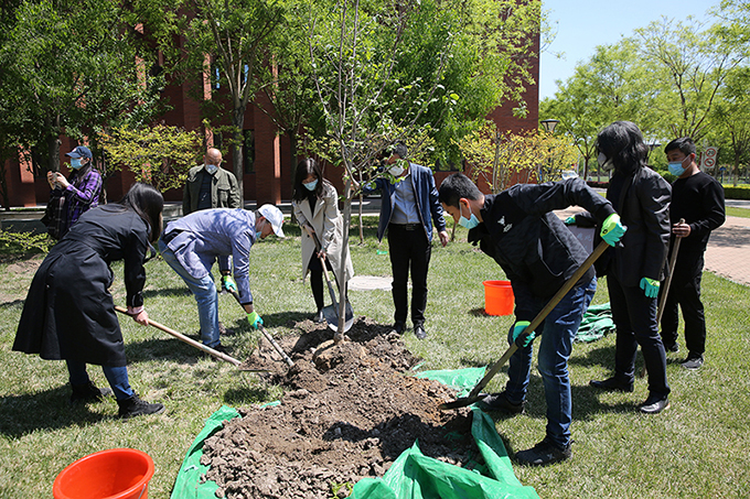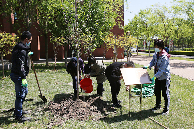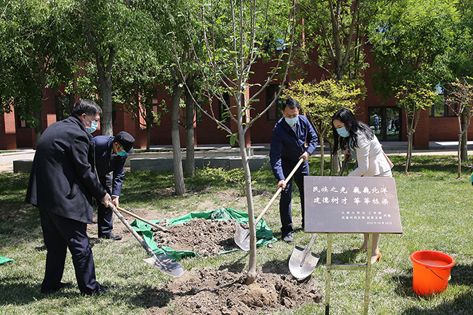 民建天津市河西区委会经贸支部向化工学院捐赠了两棵紫玉兰,寓意“天津大学为国家培养了莘莘栋梁之才”,来自两个党派的支部成员们一起培土浇水,将其种植于化工学院前。