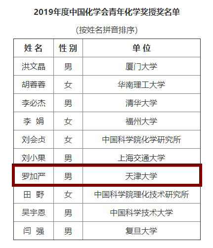 2019年12月23日,中国化学会进行公示,天津大学化工学院教授罗加严入选2019年度中国化学会青年化学奖!
