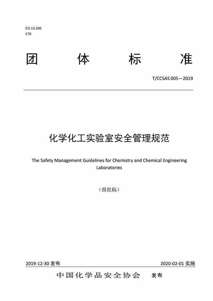 2019年12月30日,中国化学品安全协会发布公告称,批准发布《化学化工实验室安全管理规范》(T/CCSAS 005-2019)团体标准(以下简称《标准》)。该《标准》将于2020年2月1日开始实施,是国内首个关于化学化工实验室安全管理的团体标准。
