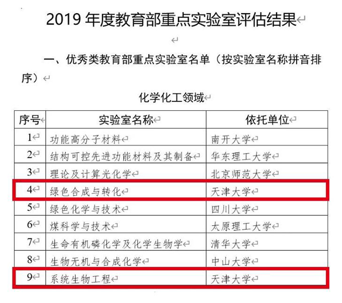 2019年12月20日,教育部科技司公示了2019年度教育部重点实验室评估结果,天津大学绿色合成与转化教育部重点实验室与系统生物工程教育部重点实验室在教育部重点实验室(化学化工领域和交叉领域)五年定期评估中,评估均为优秀!