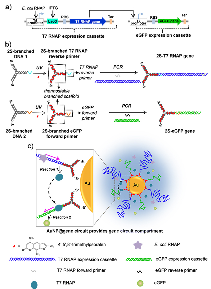 a) 模型基因线路包含调控蛋白T7 RNA聚合酶基因和报告蛋白增强型绿色荧光蛋白基因。b) 利用PCR在两种基因的一端各组装一个带有两个巯基修饰的枝状支架。c) 纳米界面上的基因线路区室化结构将调控蛋白基因和报告蛋白的之间的空间距离拉近在纳米级范围内,为无细胞级联基因表达提供了区室化。