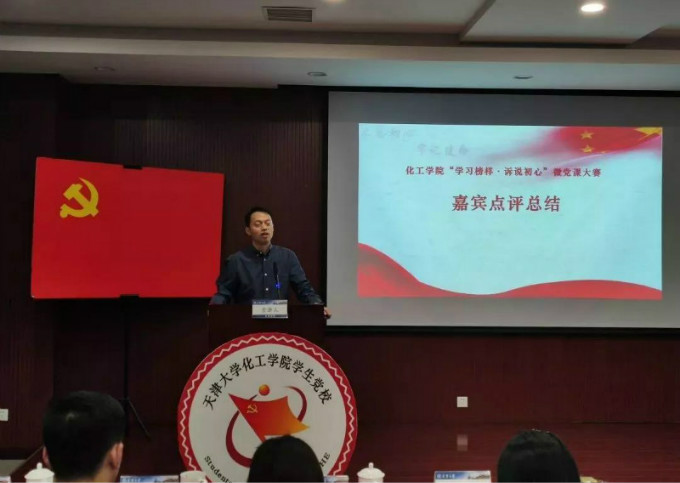 化工学院党委书记赵金铎对活动进行总结。赵金铎首先对“微党课”的形式予以肯定,表示各组学员的6分钟讲述与在场师生产生了强烈共鸣,大家选取了典型的榜样事迹,这既是一次比赛也是一场生动的主题教育。赵金铎从内容、形式、仪态等三方面向大家提出要求,希望大家能够结合自身实际更加严谨、更具感染地讲好一节微党课,并勉励在场的入党积极分子在未来的学习生活中不断进步。