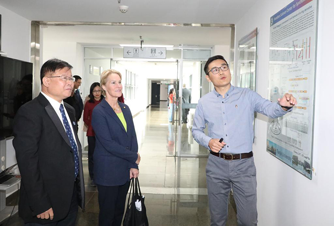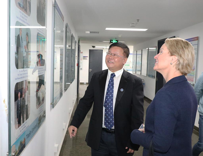 在天津大学,弗朗西斯·阿诺德参观了位于天津大学卫津路校区的合成生物学前沿科学中心。天津大学副校长、中心主任元英进教授详细介绍了合成生物学前沿科学中心的研究方向、国际合作情况和重要科研成果。在“真核生物基因组精准合成”和“基因组重排驱动进化”展板前,阿诺德教授与元英进团队开展密切交流,频频点头,对实验室在化学与生物交叉领域的学术成果给予赞许。在“新化学分子的酶进化”展板前,阿诺德教授和青年老师进行了密切交流,并对酶的设计给予指导,鼓励青年教师敢于挑战领域内公认难题。
