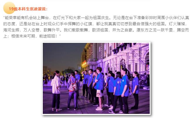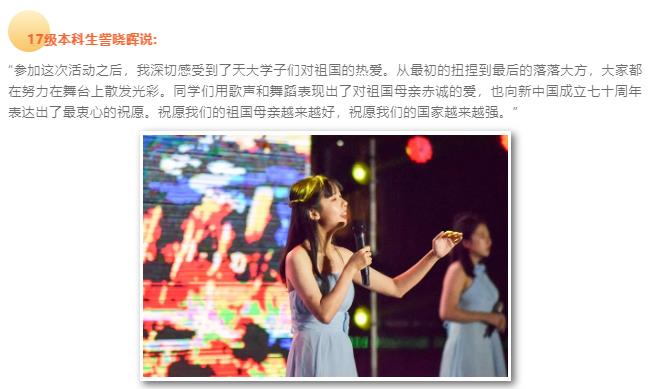 为隆重庆祝中华人民共和国成立70周年,大力唱响礼赞新中国、奋斗新时代的昂扬旋律,展现广大群众在党的领导下奋进新时代的良好精神风貌,由市总工会、团市委、市妇联联合主办,和平团区委协办的“我与祖国共奋进 歌声献礼新时代”音乐节在海河边津湾广场亲水平台广场举办。天津大学化工学院的11名同学代表天大参与此次音乐节活动,通过歌声和舞蹈展现青春活力,献礼新中国70华诞。