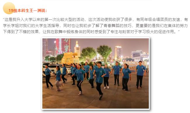 历时10天紧张的准备,从学习歌唱曲目到舞蹈编排,从音频录制到视频剪辑,最终同学们在音乐节上为天津市民带来了非常精彩的演出。合唱曲目《东方之珠》带领现场观众重温经典,伴随海河边的徐徐微风,让我们一同感受中华民族五千年的沧桑变化。歌舞《我们都是追梦人》节奏明快,清新活泼,展现了青年们奋力筑梦,为新时代祖国的繁荣昌盛努力奋斗的青春风貌。