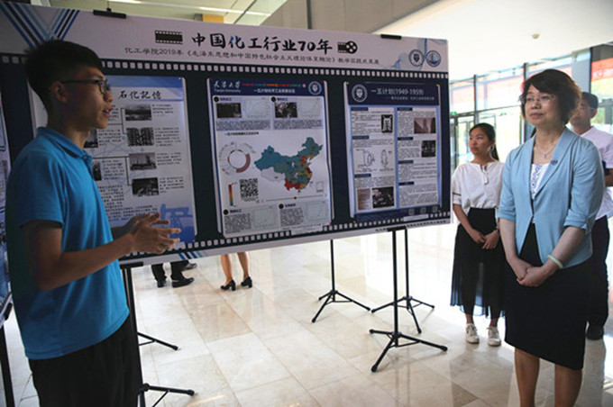 7月3日上午,化工学院2019年“毛泽东思想和中国特色社会主义理论体系概论”课后实践教学成果展在北洋园校区化工学院大厅正式开展。天津大学党委副书记雷鸣,马克思主义学院党委书记徐斌、副书记靳莹,学工部部长赵欣、副部长马德刚,化工学院党委书记赵金铎、副书记高旭东出席成果展。参加开展仪式的还有来自马克思主义学院、化工学院的师生代表。