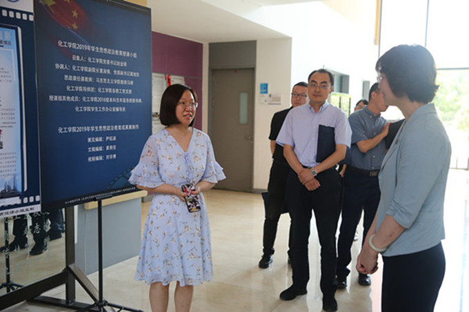展览现场,化工学院2016级本科生辅导员刘衡首先向全体嘉宾汇报了化工学院2019年“概论”课后实践教学的开展情况,随后引导各位嘉宾参观了由54张学生墙报共同组成的实践教学成果展。今年的课后实践工作,化工学院将“思政课程”与“课程思政”有机结合,把握新中国成立70周年这一重要契机,结合“概论”课学习内容,协同学院课程思政工作,通过组织全体2016级本科生共同制作“中国化工行业70年”墙报展,来更好的落地“概论”课后实践教学环节。