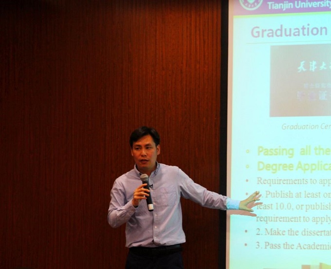 范晓彬副院长向大家详细介绍了化工学院硕士和博士留学生的毕业流程,毕业要求等学生关心的问题,同时向各位同学介绍了天津大学化工学院的学科水平及科研硕果,并表达了对各位留学生的殷切期望。郭婧就课程设置、毕业论文写作等问题向同学们进行了详细说明。