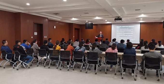 上午10:00,James Petersen教授首先面向本科生进行了“Overview of the Voiland School of Chemical Engineering & Bioengineering”的讲座,向学生们介绍了华盛顿州立大学及化学工程与生物工程系的基本情况。接着,马新宾院长带领James Petersen教授和Yong Wang教授参观了化工基础实验中心和化工技术实验中心,韩优老师和齐向娟老师分别进行了两个本科教学实验室的介绍讲解,双方就实验设备的设计,学生能力考核、实验室安全文化建设等方面进行了深入的交流和讨论。
