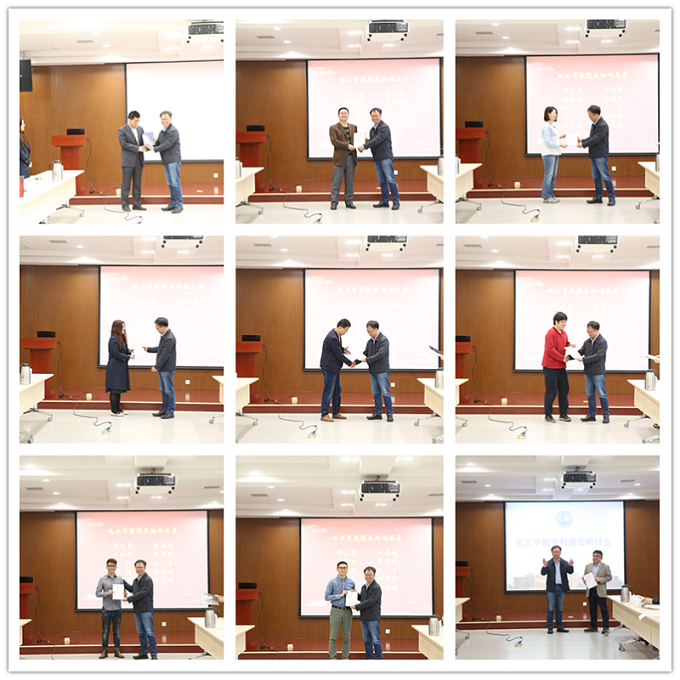 会议首先进行了院长助理聘任仪式。为让更多有能力有特长的年轻老师参加到学院管理工作中,方便更好的上下联动,为学院各项工作开展提供新思路新方法,化工学院本年度聘任11名院长助理,化工学院院长马新宾亲自为受聘助理一一颁发聘书。