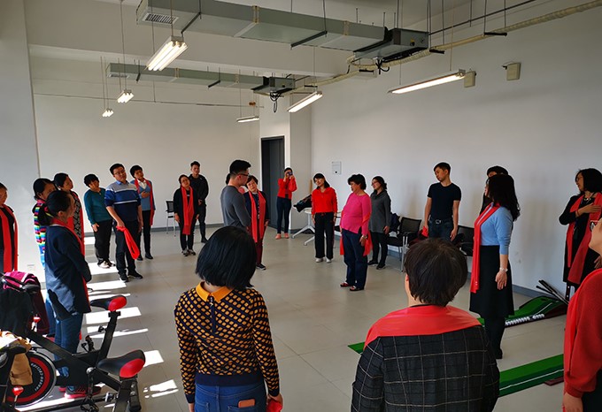随后,第一期训练项目——肩颈康复正式开始。王教练首先对各位老师平时肩颈问题做了详细了解,之后针对大家集中的共性问题作以解答并指导教职工们如何用弹力带肩绕环来缓解自我不适感。