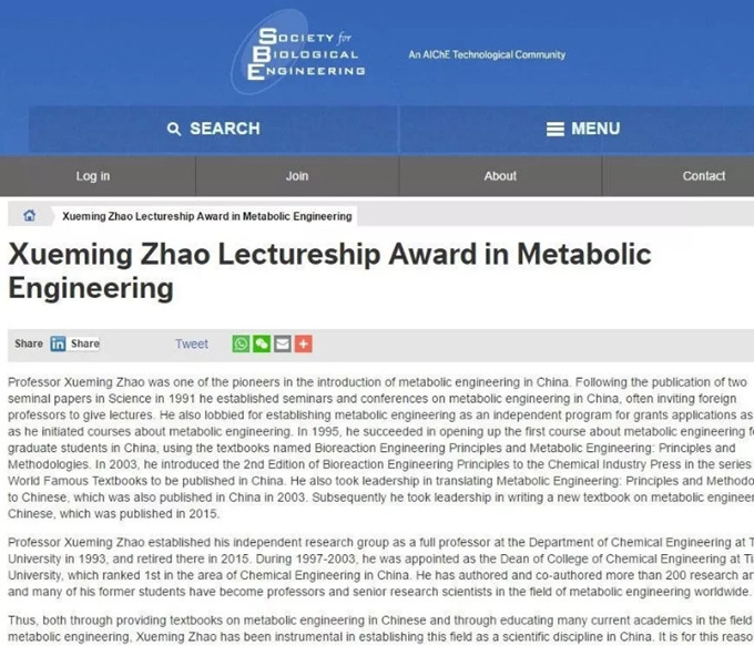 不管是为中国学生提供中文版代谢工程教科书还是培养代谢工程方面的人才,赵学明教授都一直致力于代谢工程学科在中国的发展。为此,国际代谢工程学会决定以他的名义设立一个重要的讲座奖。