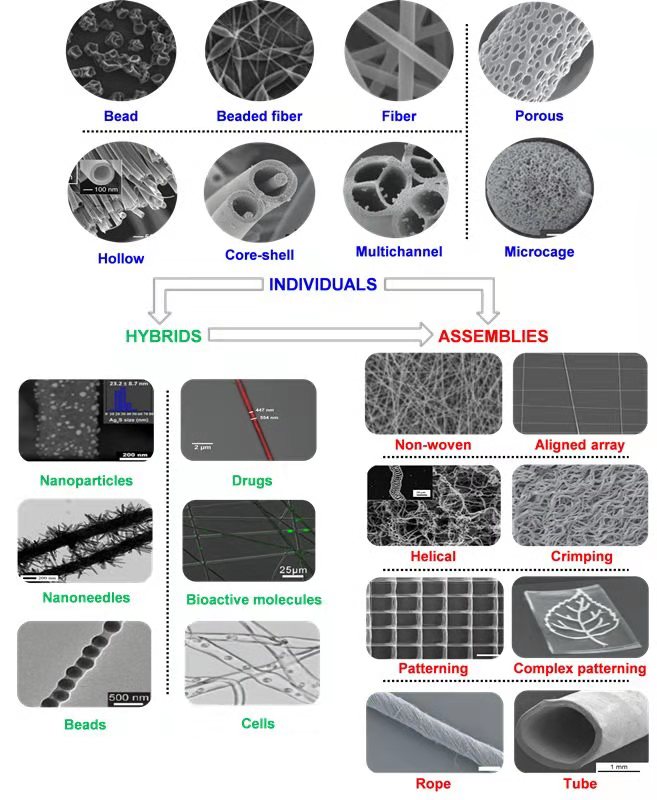 作者结合自身的研究对电纺纳米材料拓扑结构进行分类,制作了一张 “拓扑结构周期表”,根据内在逻辑关系分为三类:个体、杂化体和组装体;对该领域进行简洁明了的总结,为研究者提供有价值的参考,以便针对特殊应用功能选择特定拓扑结构和相应制造策略;深入系统地讨论了各类拓扑结构在生物医学应用中的最新进展,阐明材料结构与功能和应用之间的关系;最后,指出领域存在的挑战和未来发展方向。
