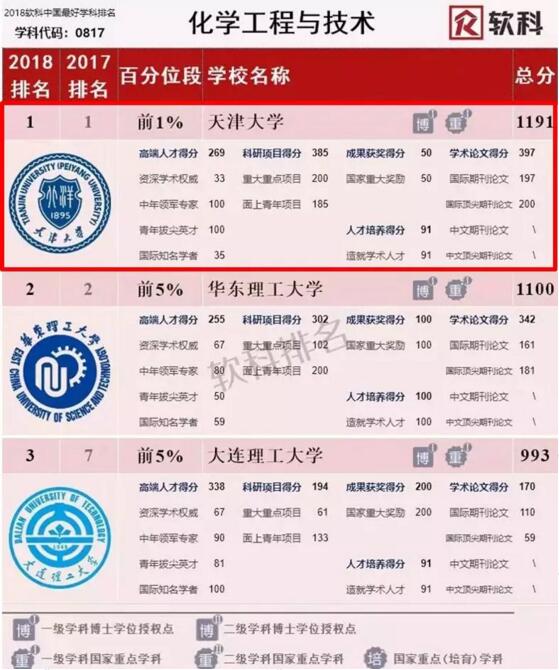 2018年11月1日,软科正式发布了2018“中国最好学科排名”,排名榜单包括了93个一级学科,其中我院化学工程与技术学科以1191总分的成绩名列第一位。