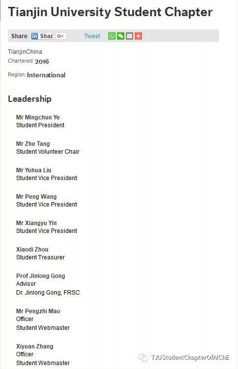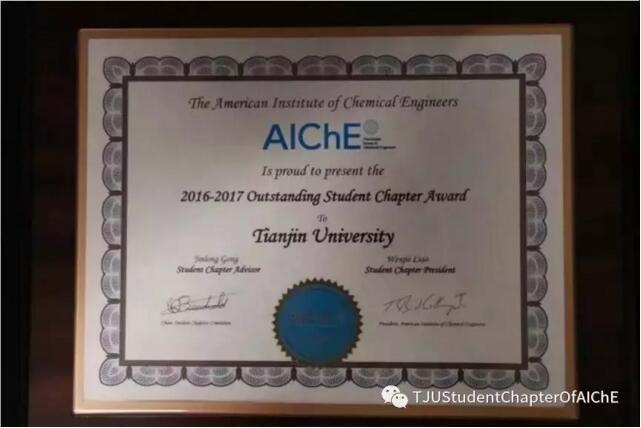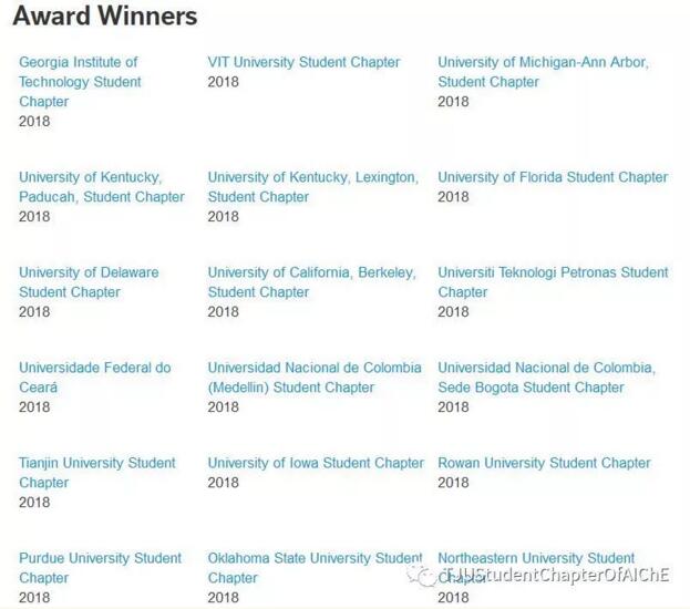 美国化学工程师协会(American Institute of Chemical Engineers, AIChE)每年从全球200多个学生分会挑选18个优秀分会授予'Outstanding Student Chapter'(杰出学生分会奖)。