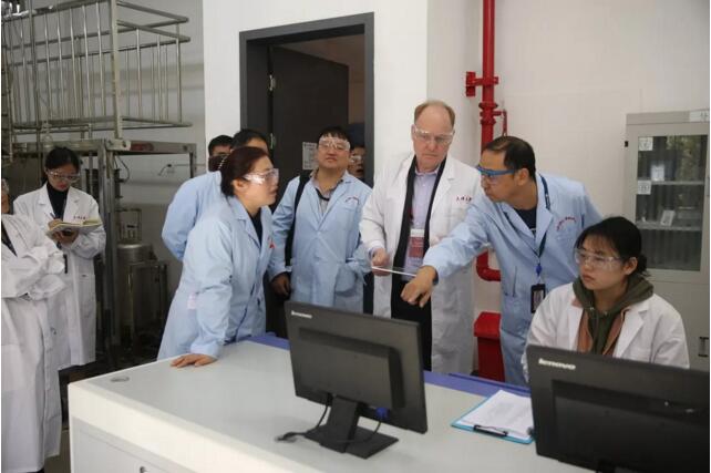 随后,专家们来到化工基础实验中心。范江洋老师进行了介绍,中心其他教师带领本科生进行了实验演示操作。实验中心自主设计和制作的高水平实验设备,实验项目既考察了学生的理论基础、动手操作,还着力锻炼学生的工程意识、创新思维、解决复杂工程问题的能力和团队合作精神等。老师们充分利用信息技术,借助线上线下多种模式开展师生互动,通过虚拟仿真技术提高学生学习效果。中心高水平的实验设备、现代化的教学手段和教师先进的教学理念受到了国内外专家们的一致赞誉。