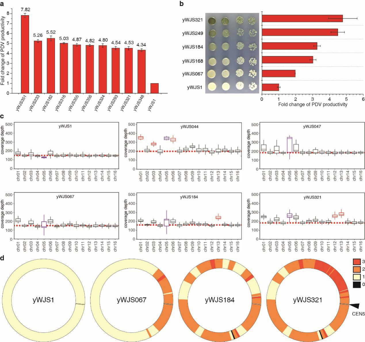 环形染色体重排过程检测到更多的非天然新型结构变异。环形5号染色体在经过第一轮诱导重排后检测到29种非天然存在的新型结构变异,在两轮连续诱导重排后增加到47个;多轮实验后共计检测到53种新型结构变异。将第一轮重排染色体中检测到的29个结构变异分别导入细胞中,在其中11种当中筛选得到了PDV合成产量提升的菌株。同时发现,未表征基因YER182W的缺失与PDV的产量提升具有相关性。