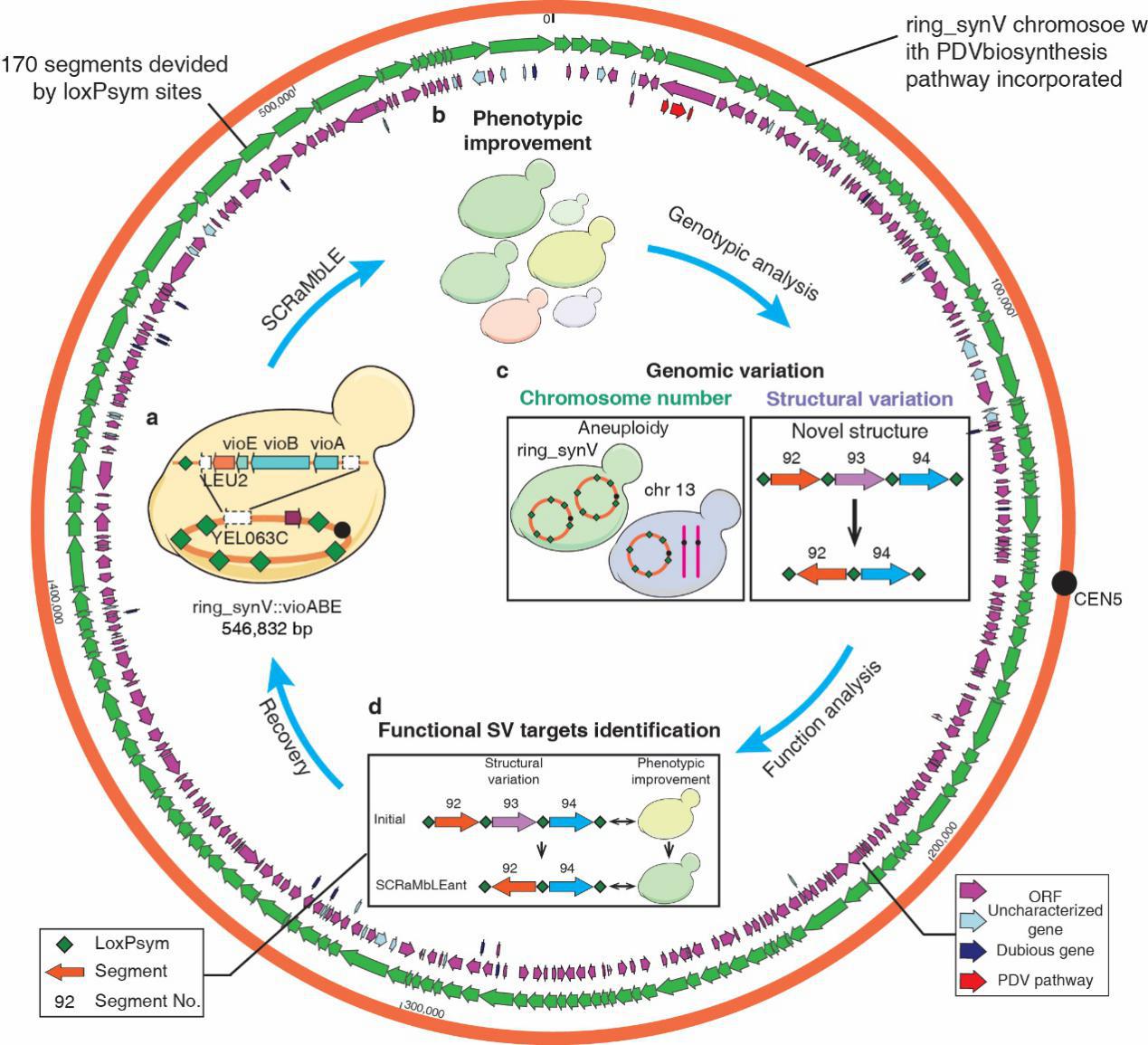 研究人员选择了抗癌活性化合物——紫色杆菌素前体物(PDV)作为目标性状,通过多轮基因组重排来探究染色体结构变异对细胞功能的影响。研究发现,环形染色体基因组重排过程中会连续产生复杂的基因组结构变异和表型优化。环形染色体的重排后,发现了1、3、6、12、13和环形5号染色体的数目加倍,形成染色体非整倍体酵母菌株。重排使染色体自身产生更多的非对称性结构变异,包括DNA片段的重复和片段插入;经过5次连续诱导重排后,所获得环形染色体的长度比原始染色体增加了一倍以上。