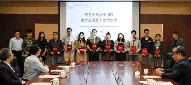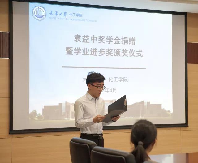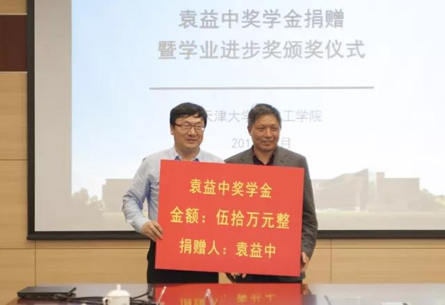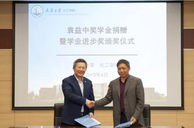 2018年4月19日下午2时,袁益中奖学金捐赠暨学业进步奖颁奖仪式于天津大学化工学院50楼224陈洪钫报告厅举行。“袁益中奖学金”是由浙江华亿工程设计股份有限公司董事长袁益中先生个人向天津大学化工学院捐资50万元成立,旨在奖励学习方面有较大进步、各方面表现优秀,愿意投身化工事业的学生们。