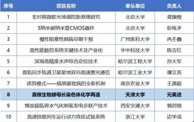 天津大学化工学院合成生物学元英进教授团队及其合作单位的真核生物酵母长染色体化学再造项目入选2017年度“中国高等学校十大科技进展”。