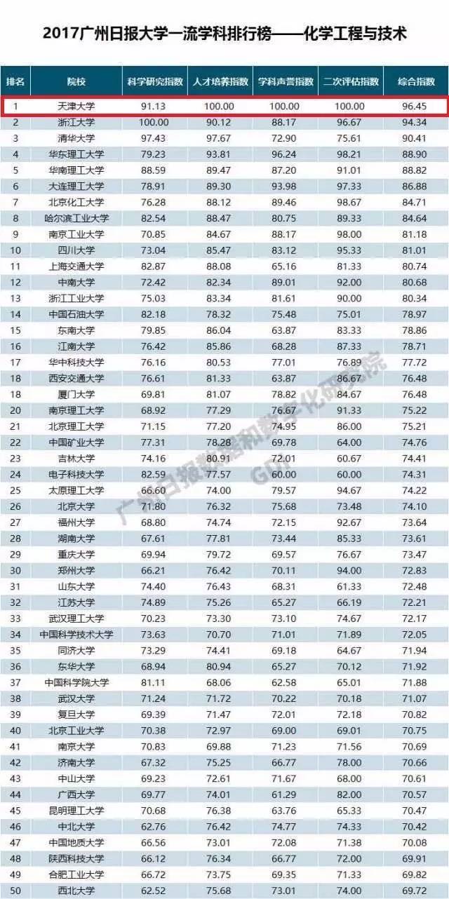 6月16日,广州日报数据和数字化研究院(GDI)发布“2017广州日报大学一流学科排行榜”,其中,天津大学化学工程与技术一级学科在本次学科排名第一。