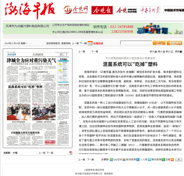 日前,天大化工学子在国际遗传工程机器设计竞赛(iGEM)上获得金奖,《中国化工报》、《中青在线》、《渤海早报》、《城市快报》等权威媒体纷纷发布新闻报道。详情如下: