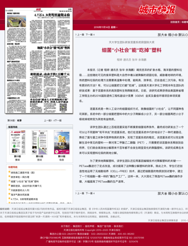 喝完丢弃的矿泉水瓶、海洋里的塑料垃圾等等,这些随处可见的废弃塑料是大自然中难以被降解的顽固垃圾,威胁着地球的环境。传统塑料垃圾的处理方法需要高温集中处理,能耗高、效率低,还会造成二次污染。有没有更好方法?有,可以让细菌把它们都“吃掉”。这就是天津大学化工学院本科生团队的研发成果——基于混菌体系的高效塑料生物降解系统。日前,该研究成果获得由美国麻省理工学院主办的2016国际遗传工程机器设计竞赛(iGEM)金奖及最佳环境项目单项奖提名。