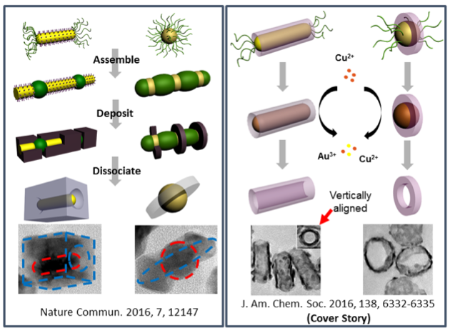 在传统晶种生长法制备多组分无机纳米粒子的过程中,无机组分在晶种表面的选择性沉积长期以来都是研究的难点,并严重制约了新型复合纳米催化剂的开发。该研究团队博士生黄志琦等与美国马里兰大学、阿卜杜拉国王科技大学研究人员合作提出了一种高分子导向的无机组分选择性沉积的方法,该方法巧妙利用接枝于晶种表面的高分子的构象变换为无机纳米生长提供导向作用,不仅得到了具有新型共轴结构和土星环结构的多组分纳米粒子,而且普遍适用于合成多种金属、氧化物,对于未来复合纳米催化剂的理性设计具有重要的指导意义。基于具有共轴/土星环结构的金-铂多组分纳米粒子,作者进一步提出了一种合金蚀刻方法,可选择性的将金核蚀刻,首次制备了尺寸、壁厚均可精确调节的铂纳米管/环。壁厚为2纳米左右的超薄壁铂纳米管具有较好的原子利用率,在燃料电池氧还原反应中体现出极高的质量活性,是商品化Pt/C催化剂的3.6倍之多。相关研究成果分别发表在《Nature Commun.》和《J. Am. Chem. Soc.》(封面论文)。