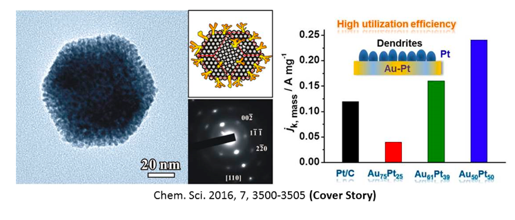 通过晶种生长法制备核壳结构,前期晶种的合成极大增加了制作成本,限制了催化剂扩大化生产进程,因此优化核壳结构的制备途径还有很大改进空间。该课题组博士后张雷等人利用Au与Pt前驱体不同标准还原电位,通过降低体系反应动力学速率,控制Au和Pt分别在晶体生长不同阶段生成,实现简易一步法制备单晶多孔AuPt@Pt十二面体,并且Pt壳层可以通过调控引入Pt前驱体进行精确控制。所获得的Au-Pt双金属催化剂表现出了优越的单位质量活性和稳定性。这一研究成果作为封面文章发表于《Chem. Sci.》。并应邀在《Chem. Soc. Rev.》发表综述(2016, 45, 3916-3934)。