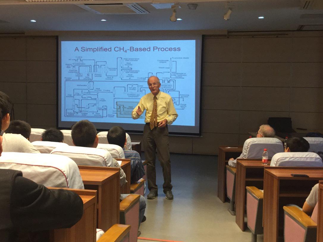 访问期间,Edward L.Cussler教授在26教学楼为学校师生作了题为“An Alternative Ammonia Synthesis”的学术讲座。讲座介绍了一种将风能、膜技术、制氢技术相结合生产合成氨的新方法。这种方法通过小巧的设备,利用电解水中的氢气和膜分离空气中的氮气,简便高效地实现了氨的合成。讲座还分析了这种分散式合成氨技术在不同地区应用的可行性及其广阔的发展前景。Cussler教授的幽默风趣和对国际化工大方向的洞察能力、以及他将科学理论大胆用于工程实践的学术风格,使师生受益匪浅。