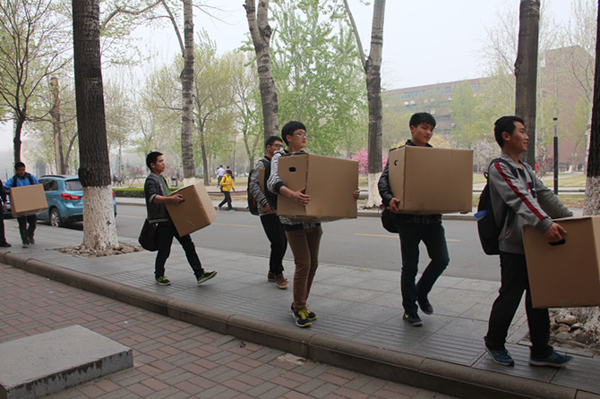 早上9点左右,在应用化学(工)三班班长张利民的指挥下,参加活动的七位同学准备好纸箱子,开始收拾行李、装箱,为模拟搬迁活动做准备。七位同学模拟搬迁新校区时的情景,选择自己准备带去新校区的行李,收拾装箱。一个多小时后,原本摆放着各种物品的桌子、架子、柜子被整理完毕,所有要带去新校区的物品都被装入写着自己名字的箱子中。11点整,随着班长张利民的口令:“出发”,七位同学提起箱子,向天津大学东门出发。到达东门后,七位同学放下箱子休息。休整完毕后,七位同学将箱子搬回宿舍,将自己的物品放回原位,摆放整齐,此次活动到此结束。