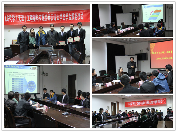 12月3日下午,LG化学(天津)工程塑料有限公司天津大学奖学金颁奖仪式在化工学院三层会议室顺利举行。LG化学(天津)工程塑料有限公司总经理李時皓、人事部负责人代理谢丹华、人事部招聘专员金焕成、化工学院党委副书记薛毅与化学工程与工艺专业2011级杨成升、徐晗和2012级雷光宇等3名获得该项奖学金的同学一起参加了颁奖仪式。这是LG化学(天津)工程塑料有限公司首次在天津大学设立奖学金并举行颁奖仪式。
