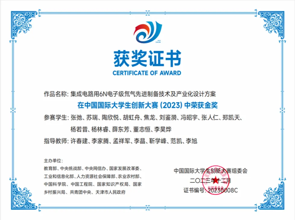 成功推动了超高纯度氘气生产技术成果的转化与应用,解决了氘气国产化技术“卡脖子”难题,显著降低了生产成本,确保了产品质量的一致性,相关成果获得“中国国际大学生创新创业大赛(2023)产业命题赛道”全国金奖。通过卓越工程师产教融合培养,提升了我国电子特气国产化率,带来了巨大的经济效益和社会效益,并为培养服务集成电路领域工程技术领军人才贡献了“天大经验”。