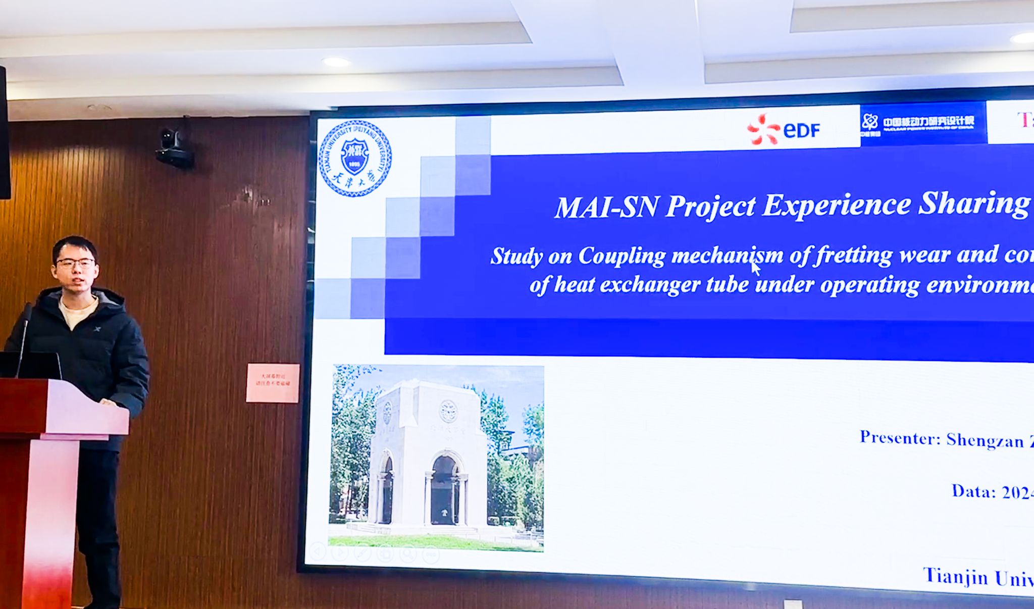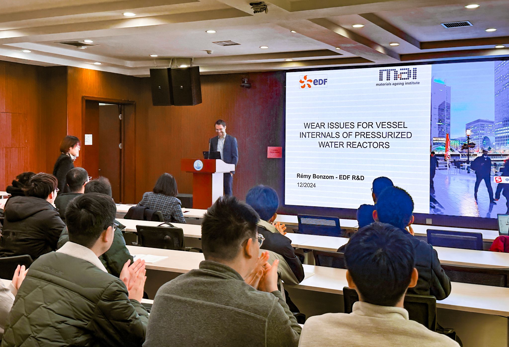 随后,Rémy Bonzom为化工学院研究生带来了一场主题为“WEAR ISSUES FOR VESSEL INTERNALS OF PRESSURIZED WATER REACTORS”的讲座。Rémy Bonzom详细讲解了压水堆内部结构在高压、腐蚀环境下的磨损机制,特别是磨损与腐蚀对材料性能的影响,深入分析了原生水环境下的微动磨损失效的现象。讲座理论与工程案例结合,内容丰富,与会人员踊跃提问交流。中法第一期博士生联合培养项目培养的张声赞博士回校为大家分享学习体会,新一期联合培养项目博士生王嘉炜汇报了本期联合培养项目的情况。