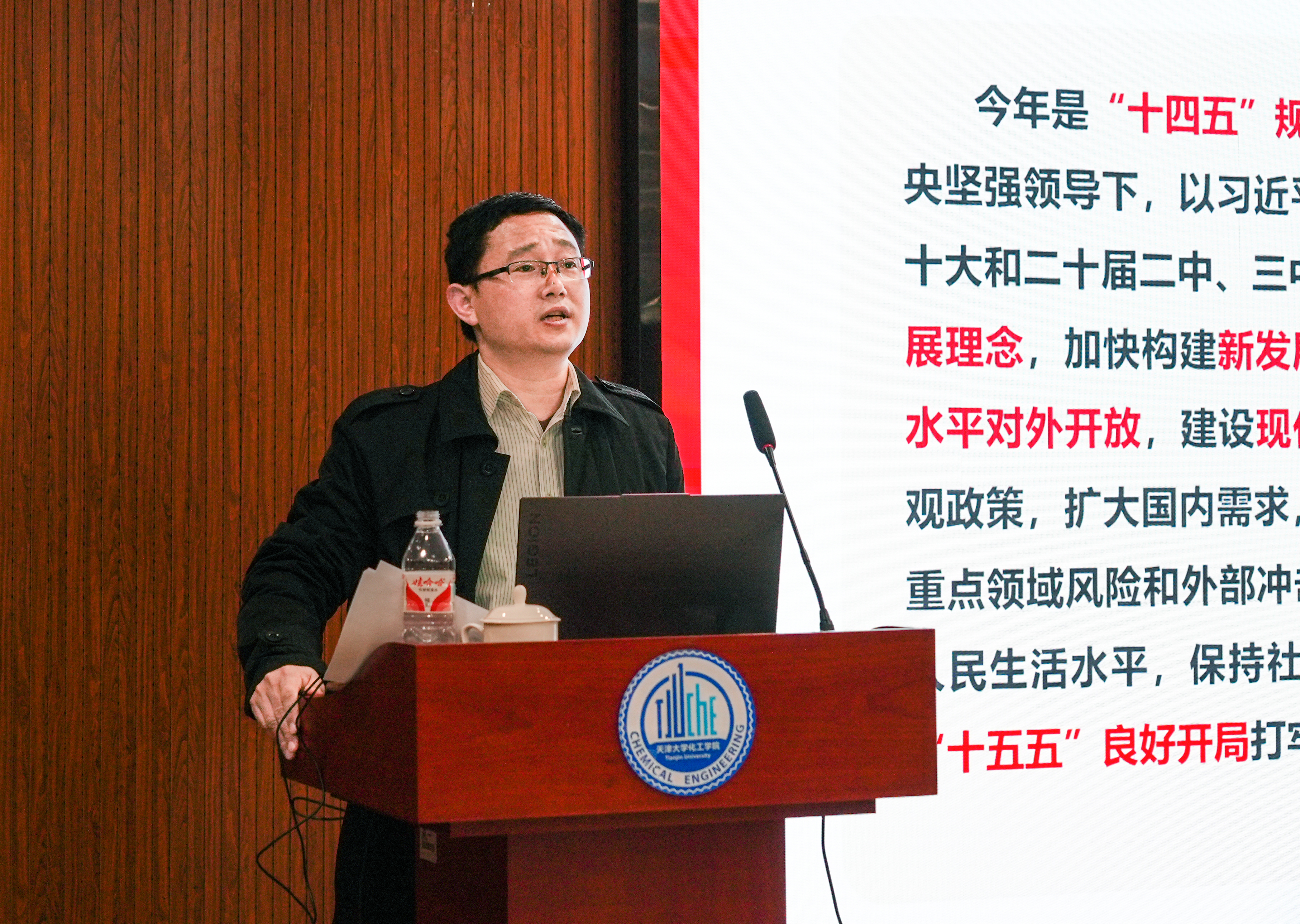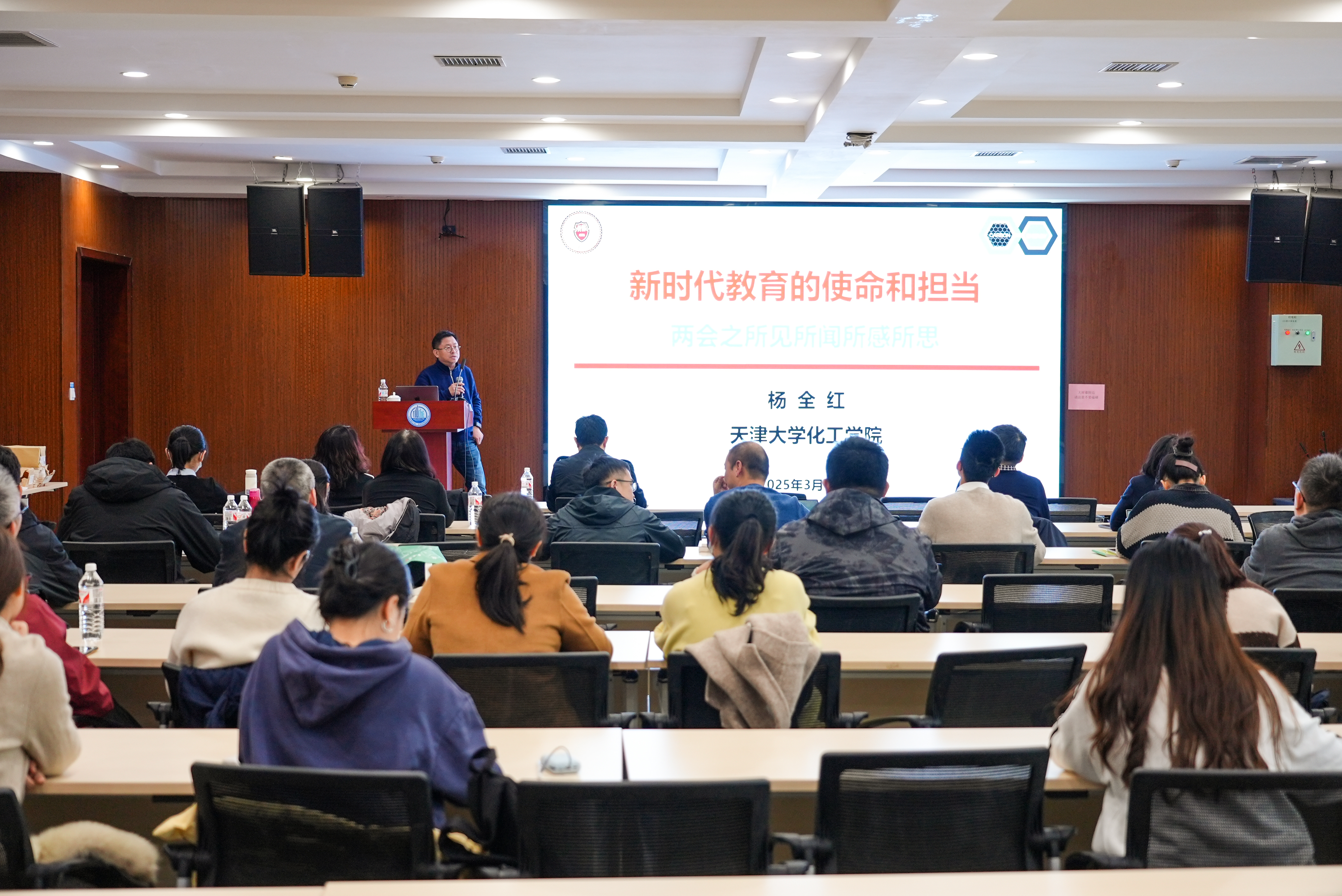 为全面准确领会2025年全国两会精神,更好的促进党建工作和事业发展“一融双高”,3月14日,化工学院“党员大讲堂“邀请全国政协委员、化工学院北洋讲席教授杨全红,做题为《新时代教育的使命和担当—两会之所见所闻所感所思》的专题辅导报告。化工学院党委委员、中心组成员及师生党员近100人参加报告会。报告会由化工学院党委书记汪怀远主持。