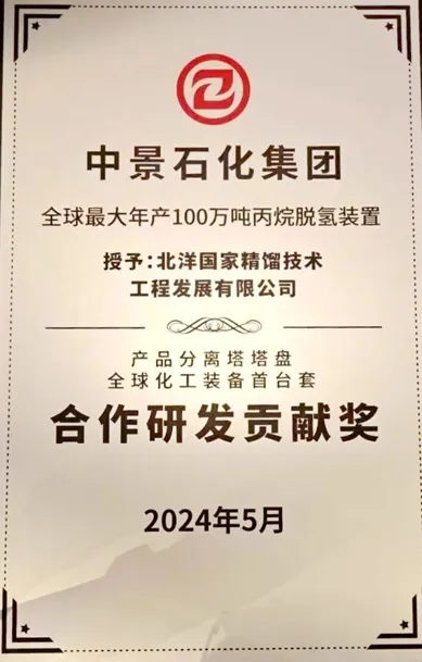 产品分离塔是丙烷脱氢装置中的关键设备,塔径达到10.8m,分离难度大、技术水平要求高。为解决该技术难题,精馏中心开发了新型分布结构的高效低能耗精馏技术,并由下属北洋国家精馏技术工程发展有限公司完成设计制造,一次性运行成功,效率高,生产能力大,各项指标达到国际领先水平,节能10%以上。获得了中景石化董事局主席翁声锦先生的高度赞誉,,投产仪式上,翁先生亲自颁发了“首台套高端装备合作研发贡献奖”。