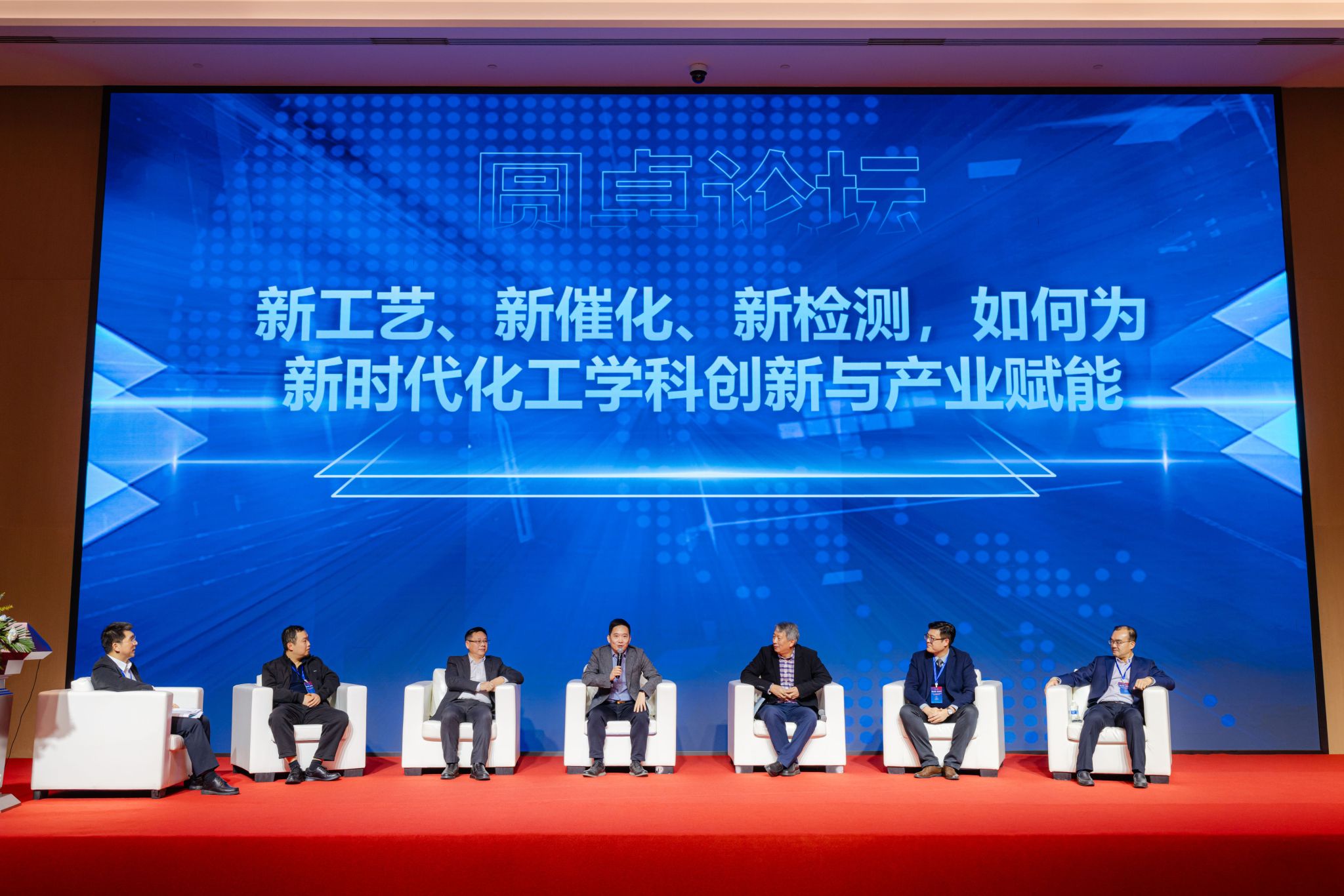 在专题报告后,论坛举行了以“新工艺、新催化、新检测,如何为新时代化工学科创新与产业赋能”为主题的圆桌讨论,与会嘉宾思想碰撞,共话未来。在化工学院副院长刘国柱的主持下,中自科技陈启章董事长、天津质谱仪器有限公司杜康总经理、成都三香汇香料有限公司李良龙董事长、天津大学谭超教授、四川晨光设计院谭成波主任、成都佰思格科技有限公司王瑨总经理等产学研各方代表,从不同角度分享了见解,共同探讨了技术创新驱动产业升级的协同路径。
