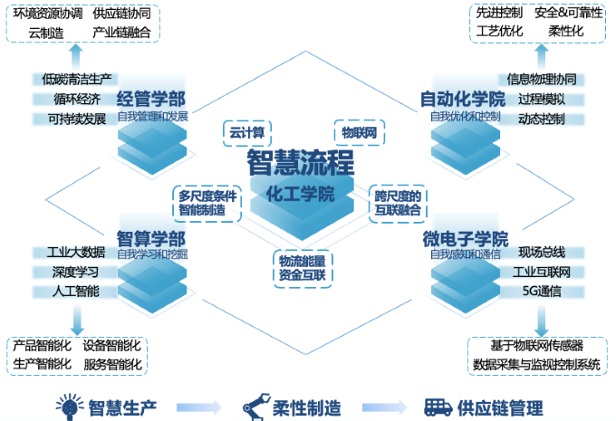 基于以上现代工业对专业人才在知识体系的新要求,通过化工学院、自动化学院、智算学部、经管学部和微电子学院等多学院跨学科共建,探索交叉学科人才培养新模式,构建“智慧生产”、“智慧工厂”、“智慧物流”、“智慧经营”四个微专业,并于今年率先开启“智慧生产”微专业。